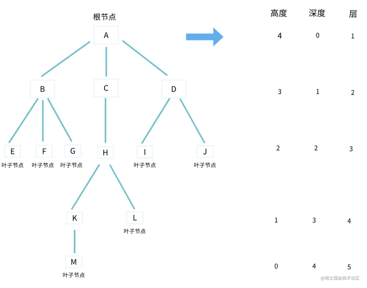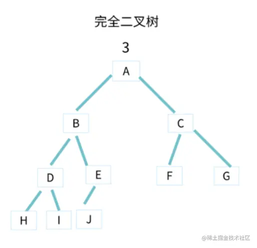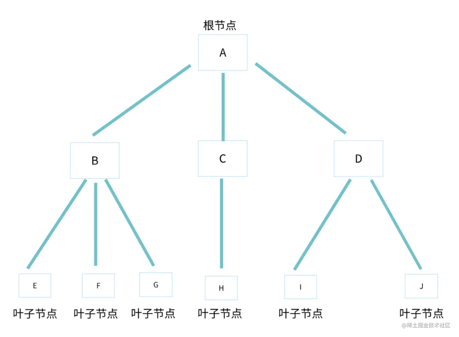 - 叶子节点:没有子节点的节点,如 E、F、G、H、I、J。