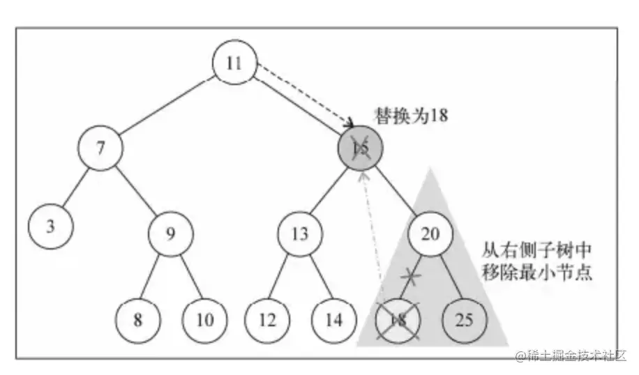 // 删除后要替补上来的节点的键值大小必须在已删除节点的左、右子节点的键值之间,且替补上来的节点不应该有子节点,否则会产生一个节点有多个字节点的情况,因此,找右侧子树的最小值替换上来。
