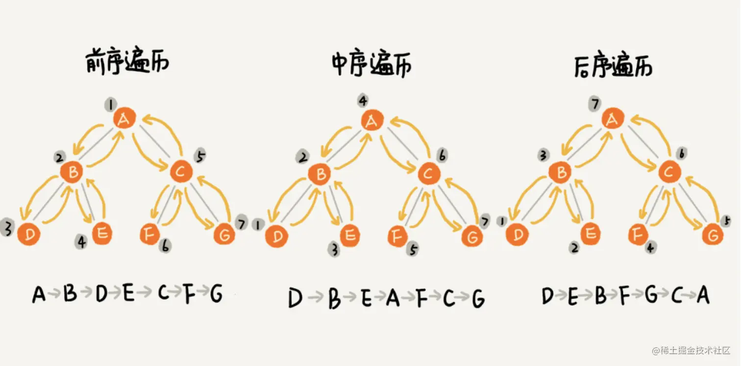 后序遍历(左 => 右 => 根) —— 对于树中的任意节点来说,先访问它的左子树,然后再访问它的右子树,最后访问它本身。