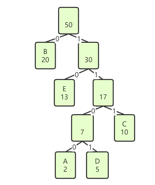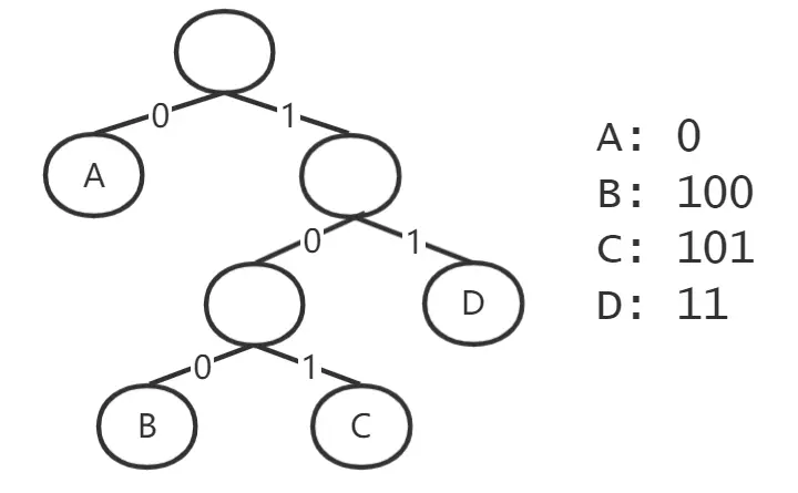 - 编码为根结点到该叶子结点的路径。由于二叉树非左即右,恰好切合计算机存储的非0即1,如果令左0右1,就可以用01表示根到叶子结点的路径作为编码。且叶子结点没有子结点,故这种编码不会存在前缀问题。