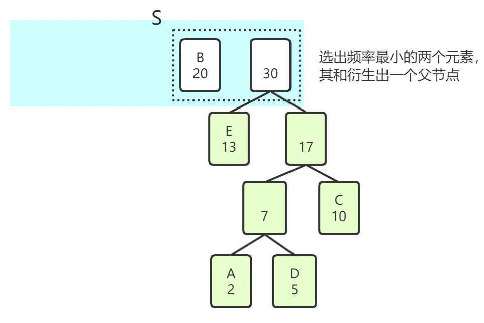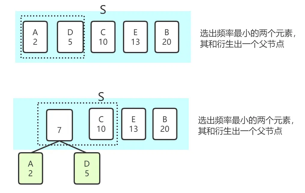 - 每一次从S中选出两个频率最低的字符,分别创建成两个树上结点,接着将这两个字符的