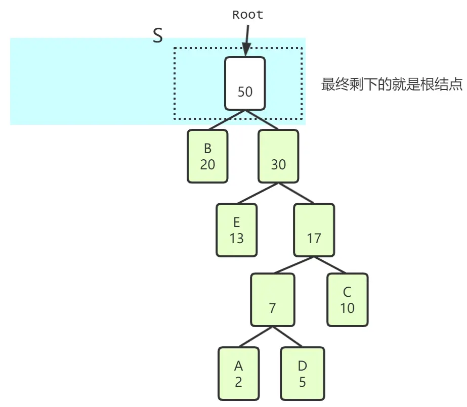 频率相加衍生出一个父结点,父结点再作为一个字符放回集合S中。 - 重复以上操作,直至S集合中只有一个结点。这个结点就是根,保存了所有字符出现频率的总和。