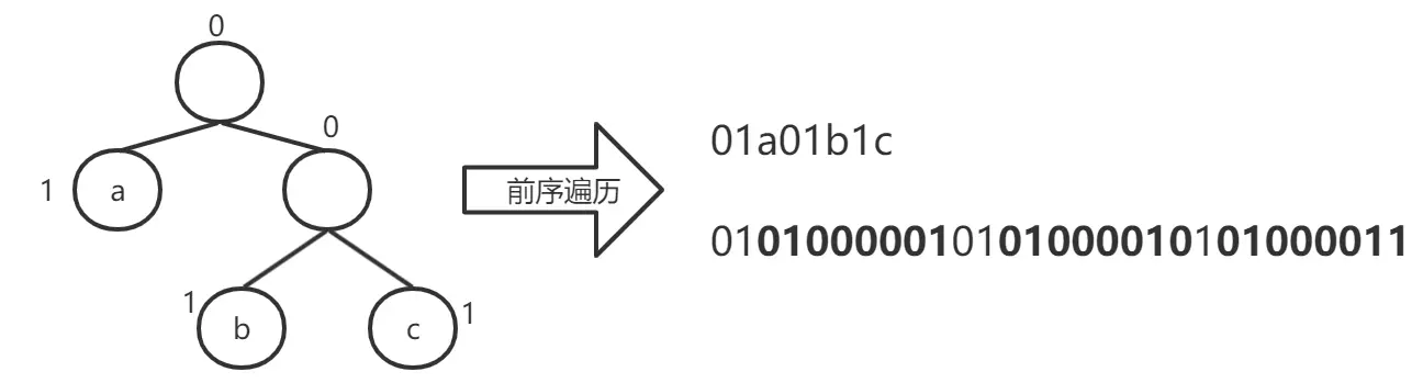 假设规定好传输前序遍历序列,以0表示分支结点,以1表示叶子结点,一旦遇到叶子结点就补上叶子结点的字符信息(8bit)。这样之后在解码的时候,只需要按照前序遍历的逻辑来分析01串:一旦遇到1,则后边8bit表示的是该叶子结点处的字符。