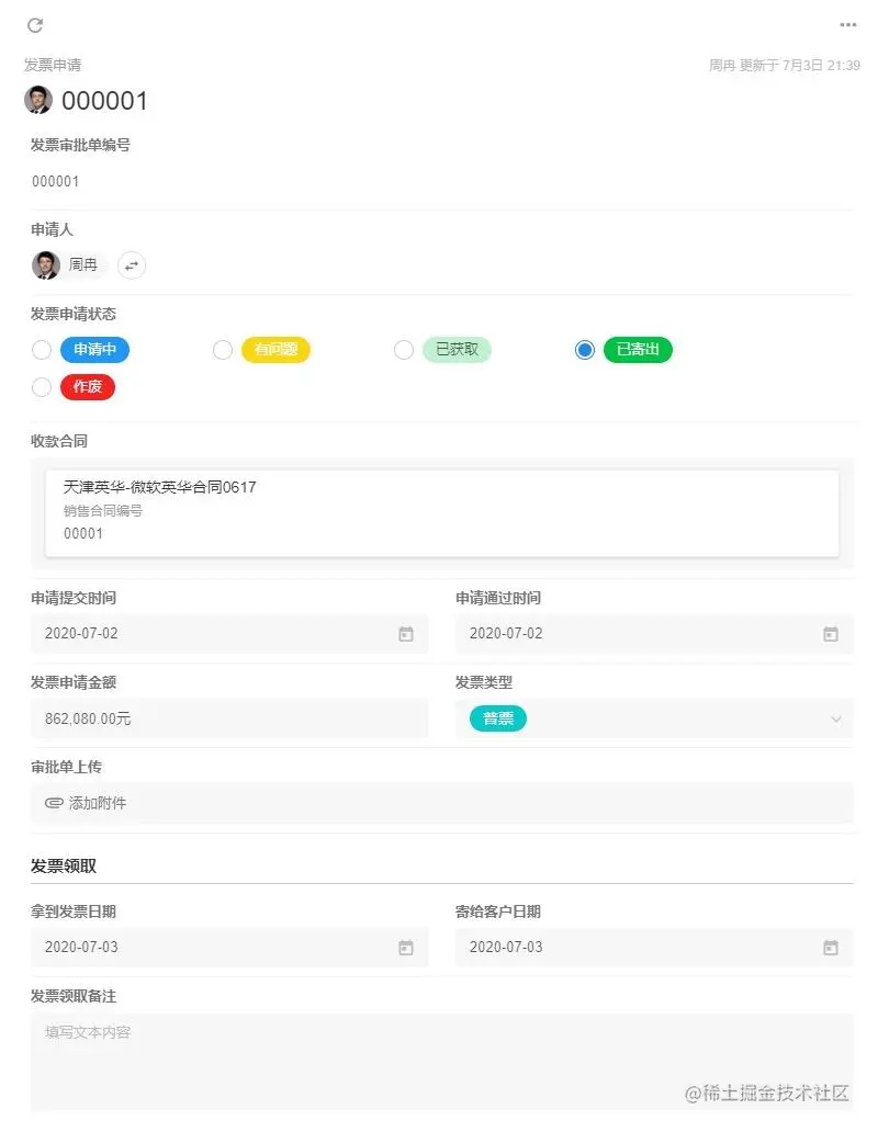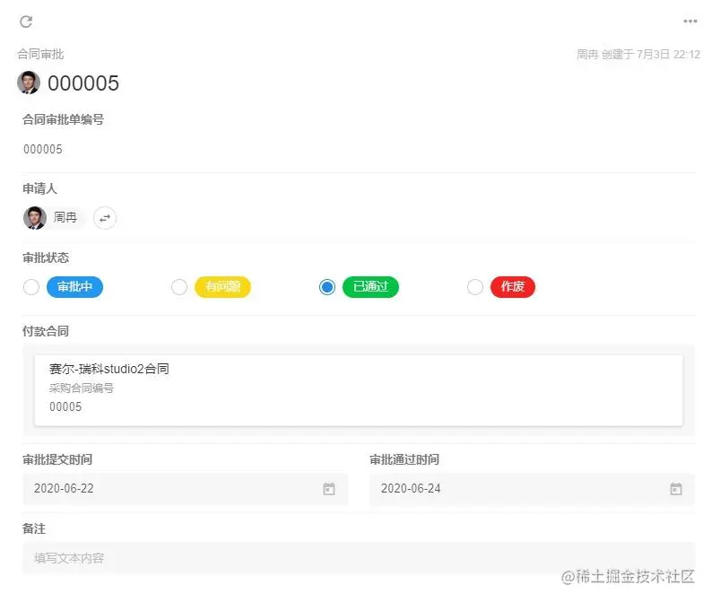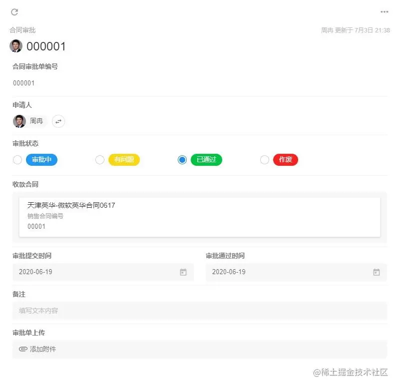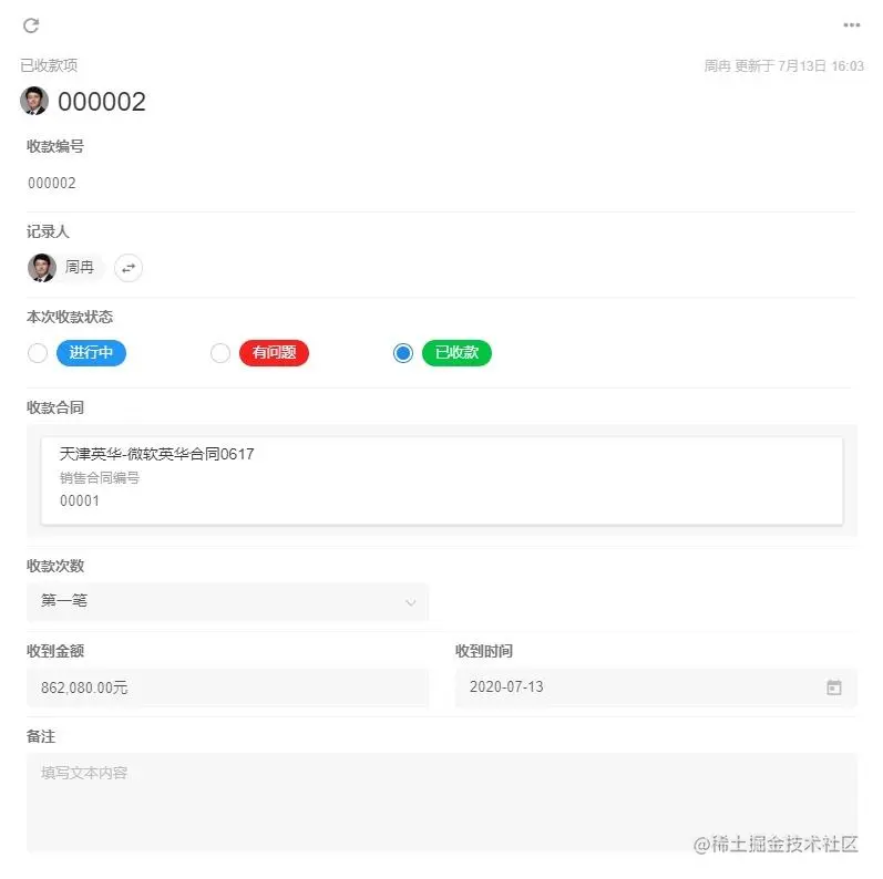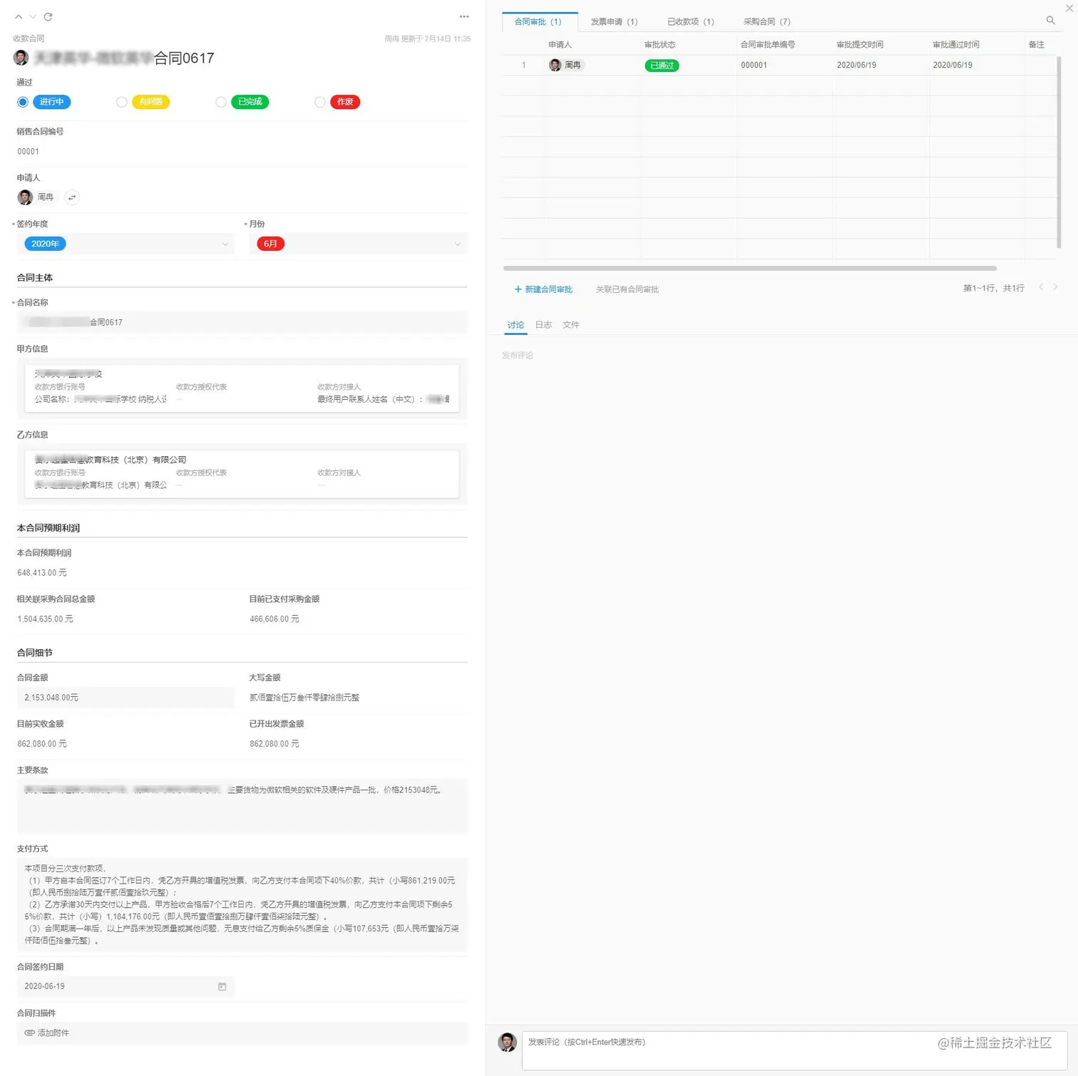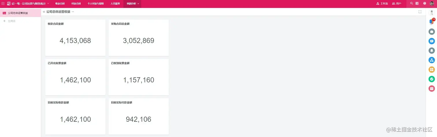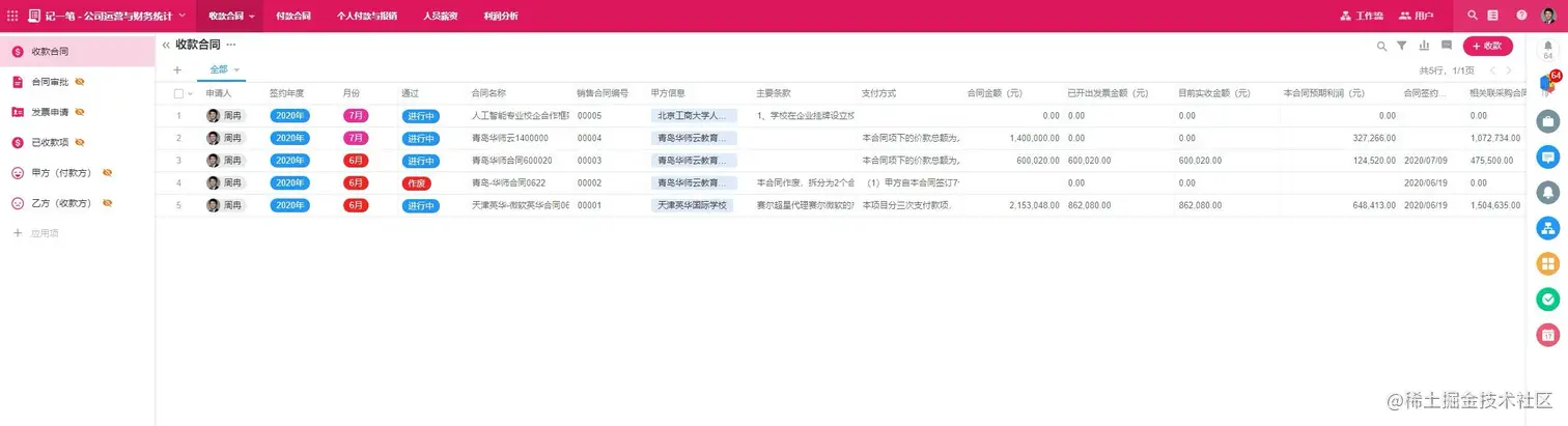 通过“收款合同”这个主线,我们可以关联合同审批、发票申请、已收款项、采购合同等数据,可以实现查看一个收款合同,就可以知道合同甲乙方信息、合同主要条款、支付方式、合同金额、目前已收金额、已开发票金额、与收款合同对应的采购合同总金额、目前已支付的采购金额、本合同预期利润等一系列业务数据。