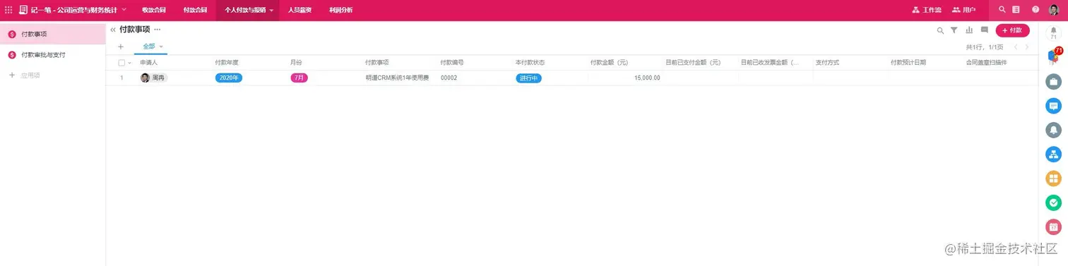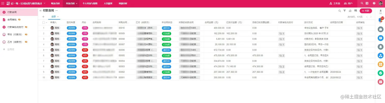 我们把业务流程、财务流程抽象出来,主要就是两点,一个是“收钱”、一个是“付钱”,这个模块就负责“付钱”,主要管理付款合同、付款合同的审批、付款申请的记录、付款笔数的记录、报销申请的记录,甲乙方银行账号等信息的记录。