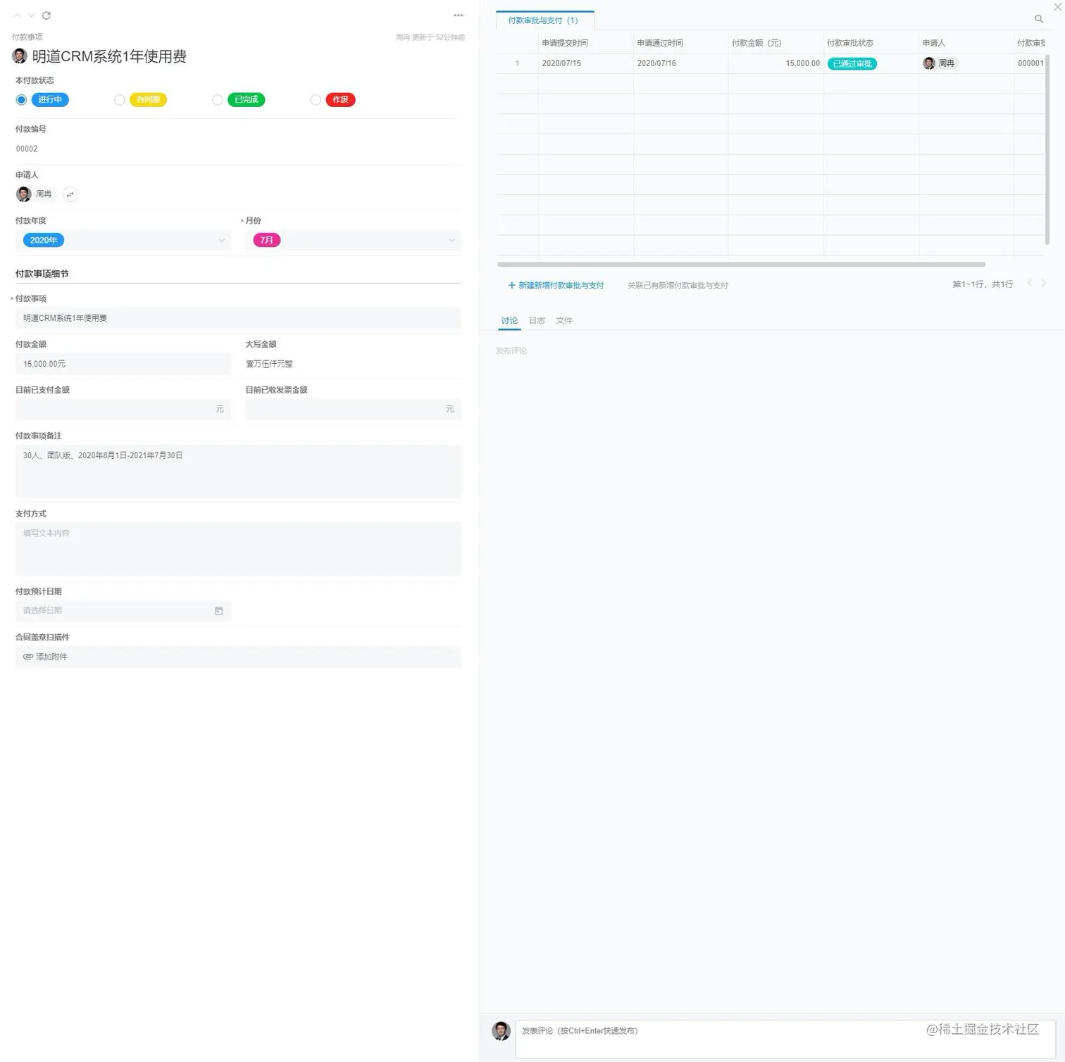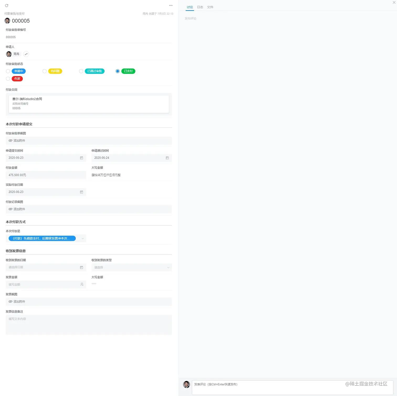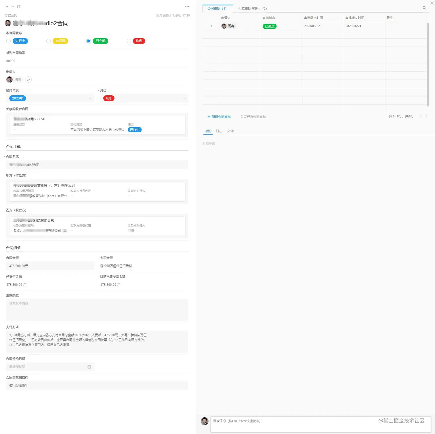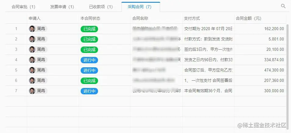 通过“付款合同”这个主线,我们可以关联合同审批、付款审批与支付,可以实现查看一个付款合同,就可以知道合同甲乙方信息、合同主要条款、签约年度、支付方式、合同金额、目前已支付金额、已收到发票金额等一系列业务数据。