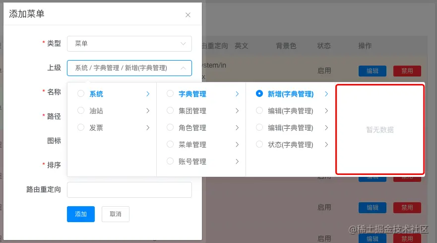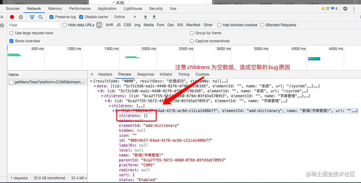 首先我们分析出现空级联原因是:由于数据是从后台传递过来的,当后端的老铁使用递归算出菜单,然后转换成json传递到前端的时候。就会出现 最底层 的子项中 的 children 为空数组,这样就会造成,空级联 的bug存在。