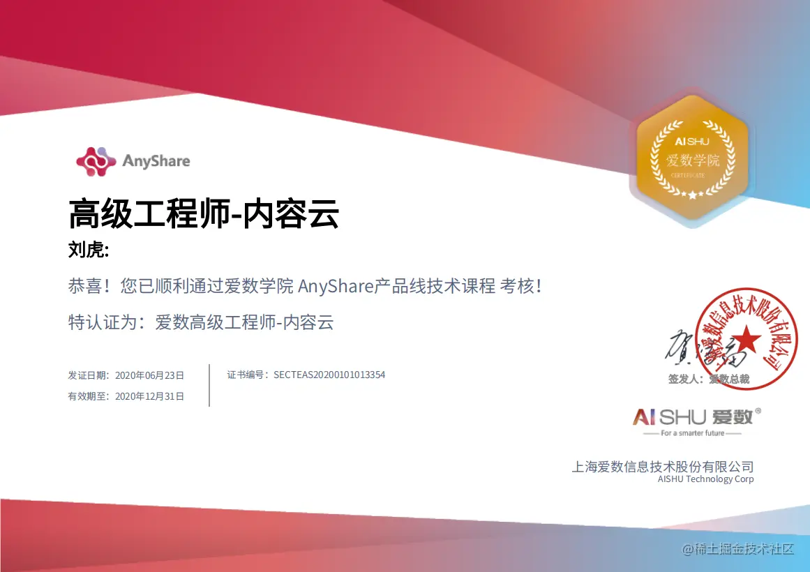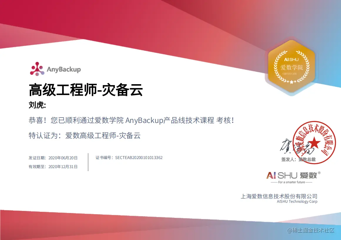 应届生工作的第一个证书!!! Jinji 2020-07-31 163 阅读1分钟 毕业后获得的第一份证书——爱数高级工程师。 考证过程中是比较痛苦的,但是在痛苦中也有精彩,6月16去上海参加考试的经历十分难忘,遇到了技术运维的各种大佬,也感受到了运维的魅力,对于刚毕业的应届生影响颇大,在今后需要继续加油!! 分享我大学时遇到的研究生学长给我的一句话,“不管在哪都要努力,即使你没考上研究生” use the code,change the world 附上证书