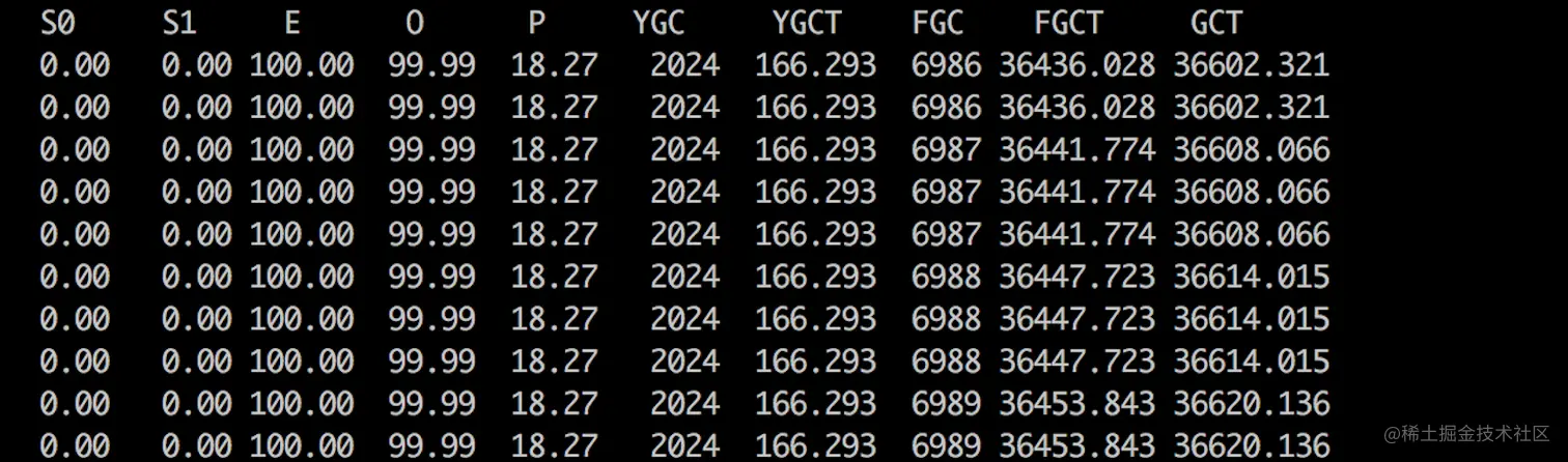 使用命令 jstat -gcutil 6902 2000 10 (6902是Java进程的PID)来观察GC的运行信息,如下图所示: