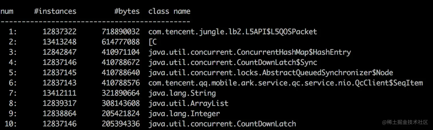 如何确定是哪些代码导致的这个问题呢?这时候就可以使用jmap查看Java的内存占用信息。jmap是JDK内置的内存映射工具,位于JDK根目录的bin文件夹下面,可用于获取java进程的内存映射信息。通过命令 jmap -histo 6902 (6902是Java进程的PID)打印出了Java的内存占用信息,如下图所示: