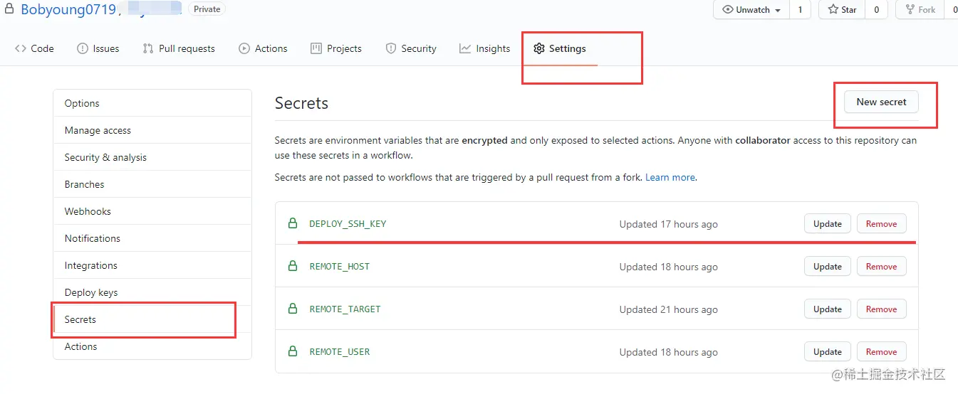 - 打开github找到项目,找到settings, 将服务器ssh的私钥,host,用户名,资源存放路径等存放在项目的settings>Secrets下