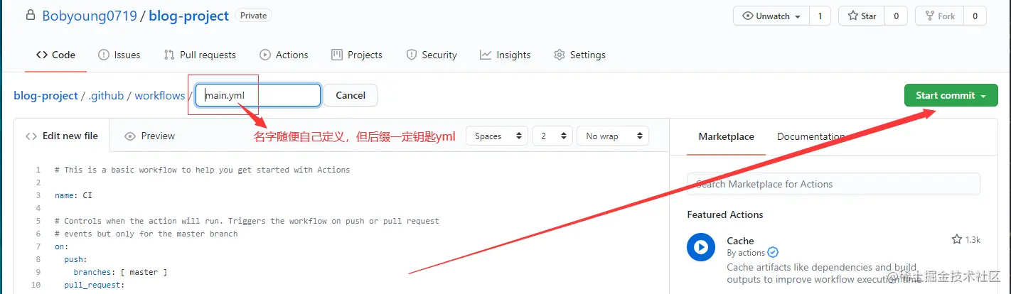 - 打开github.com(自己注册的),选择一个你自己的项目仓库, 点击Actions,可选择set up a workflow yourself也可以选择使用别人创建好的,果断start commit。(果断自己创建呀,我那么好学~~~)