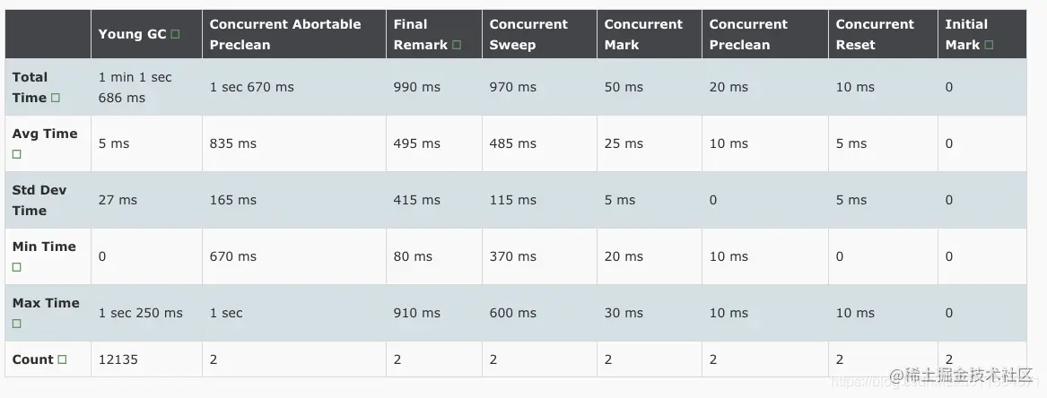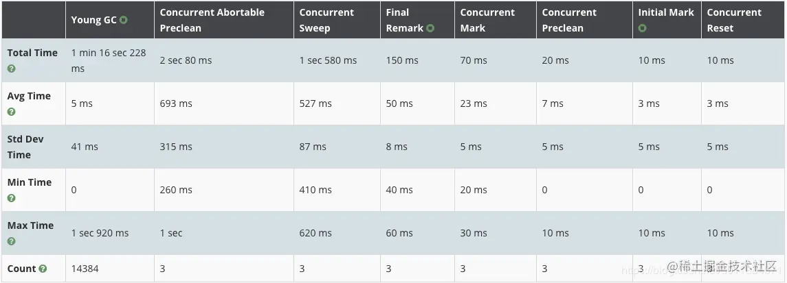 在调优之前先看下该应用的GC统计数据,包括GC次数,耗时: