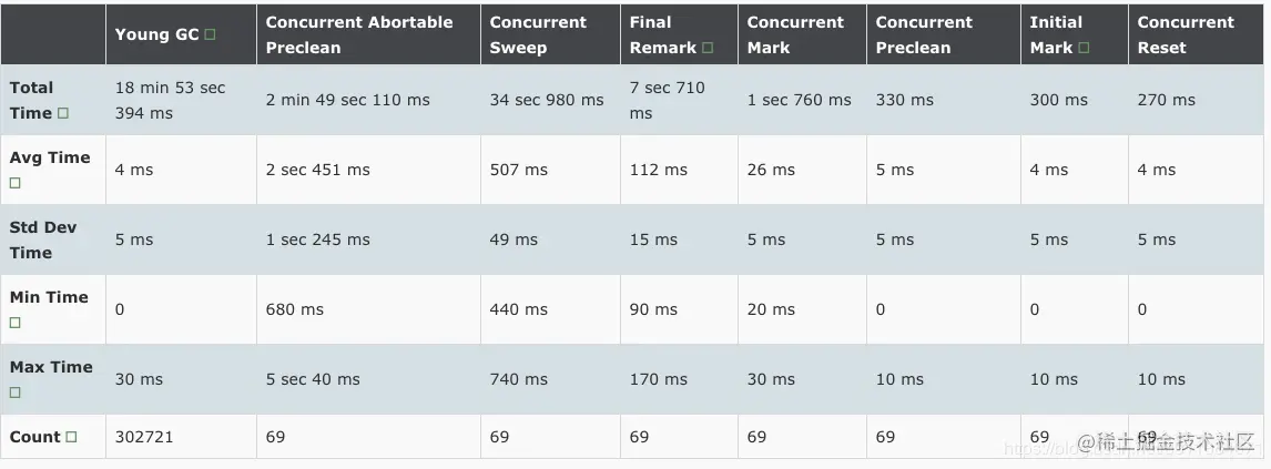统计期间内(18天)发生CMS GC 69次,其中 abortable preclean阶段平均耗时2.45秒,final remark阶段平均112ms,最大耗时170ms.