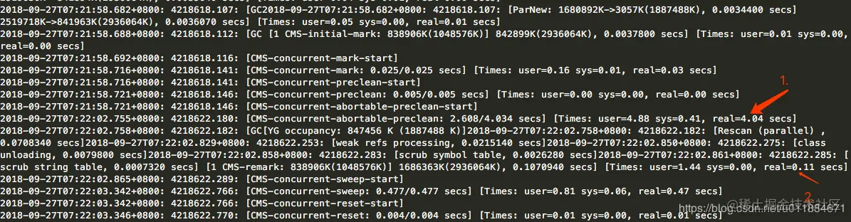 箭头1 显示abortable-preclean阶段耗时4.04秒。箭头2 显示的是remark阶段,耗时0.11秒。