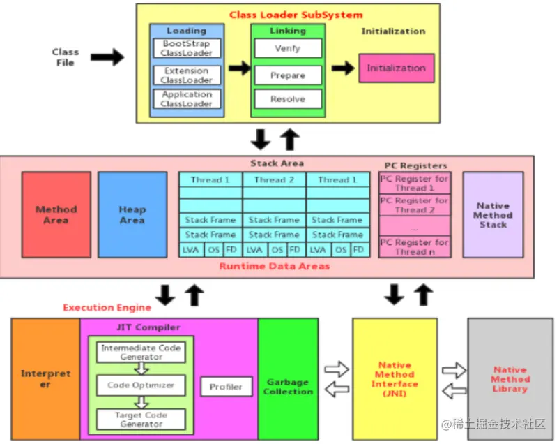 Java代码经过编译器编译成字节码文件,然后经过类加载子系统,经过类加载机制(包括:加载、连接【验证、准备、解析】、初始化阶段)加载入JVM内存区域,经过执行引擎和本地方法库接口运行代码。在运行时数据区部分,对于线程私有的虚拟机栈其中还有可细化的部分,每一个方法对应着一个栈帧,每一个栈帧又包含局部变量表、操作数栈、动态连接、方法返回地址和附加信息。执行引擎部分还有字节码的解释器、JIT即时编译器、垃圾回收。