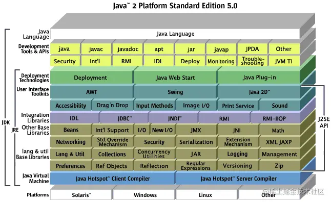 先来看下图,这是Java技术体系图,可以看到底层是JVM,JVM是字节码运行的环境,但是光有环境是不能运行Java代码的;JRE是Java运行环境,它包含了JVM标准实现及Java核心类库;我们平时写代码是需要在JDK,或者在各种IDE上编写代码
