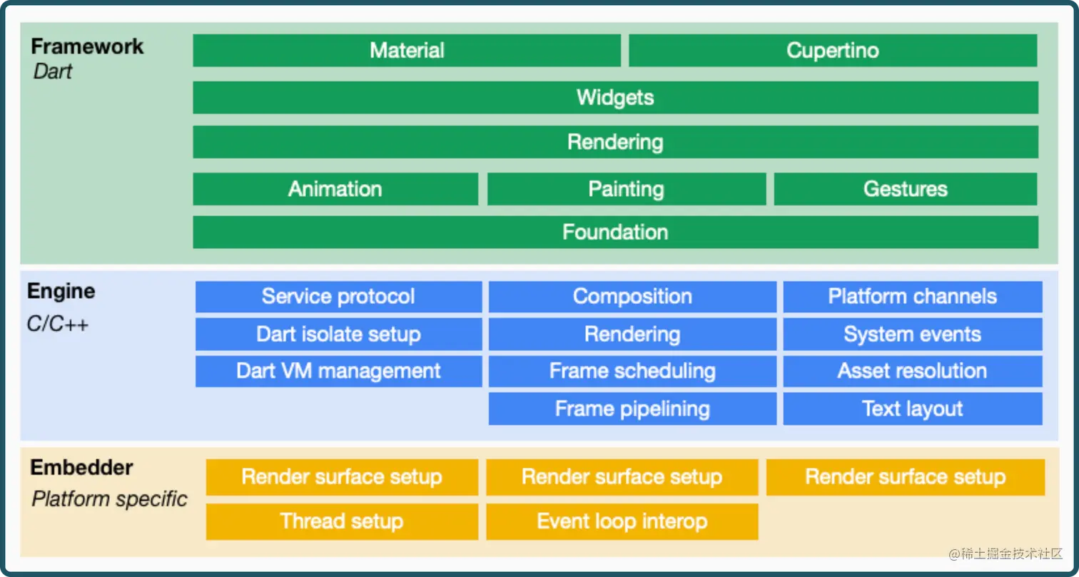 正如你所看到的,最顶层(Framework)包含的组件类型与常规的Flutter架构几乎相同。