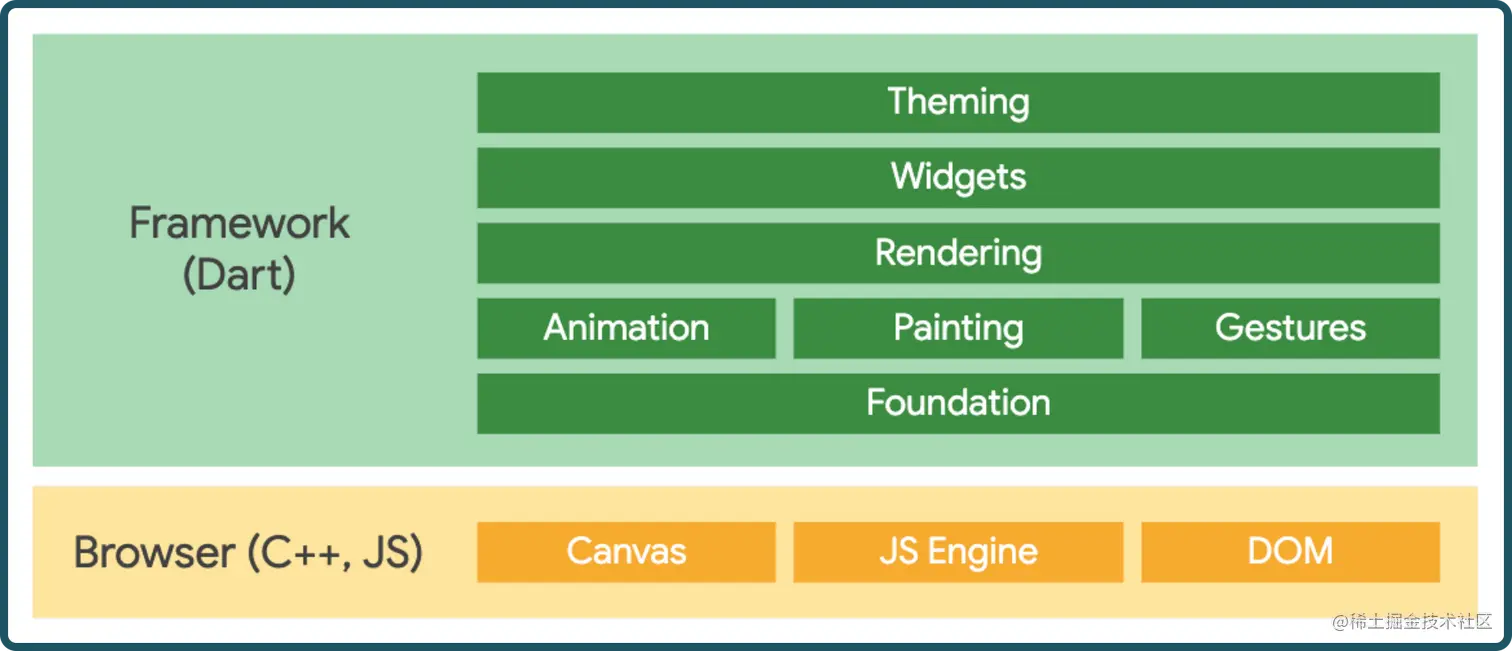 主要的区别是在Browser层。实际上,在移动架构中存在的最底层的两个独立层只被一层所取代。它没有使用Skia图形引擎(因为浏览器上不支持),而是使用了一个JavaScript引擎。Flutter web涉及到将Dart编译成JavaScript,而不是用于移动应用的ARM机器代码。它使用DOM、Canvas和CSS的组合,在浏览器中渲染Flutter组件。