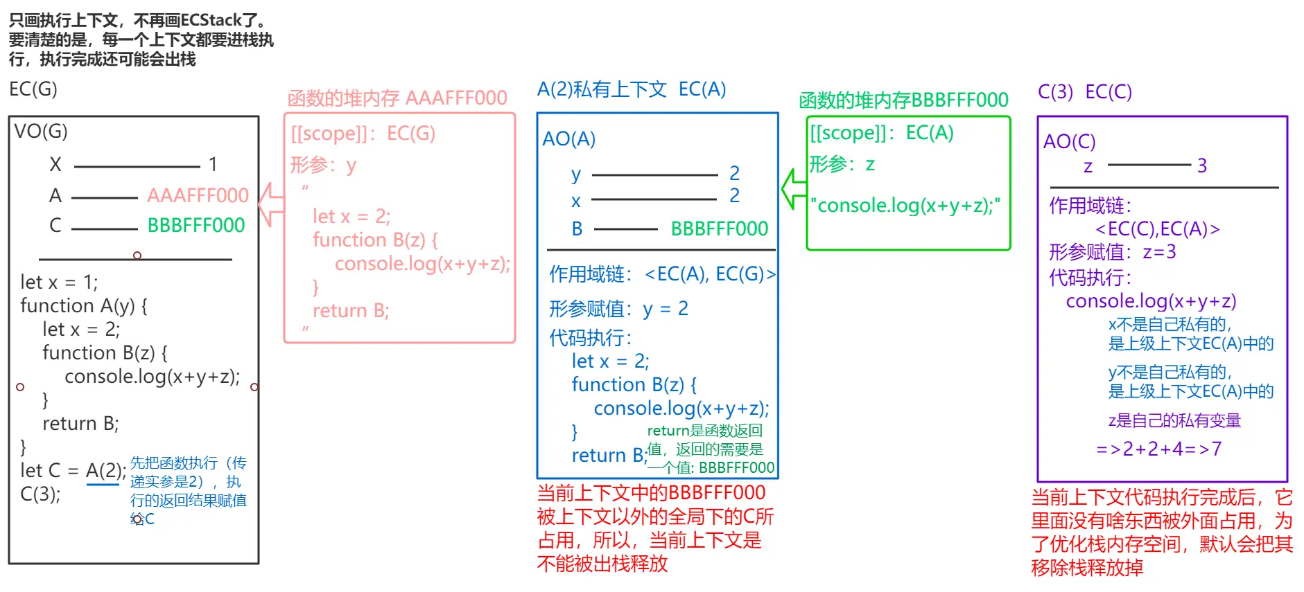 我们注意到,函数A执行的时候,形成一个私有上下文,而依赖于这个私有上下文,又创建了一个堆BBBFFF000,而这个堆又被当前私有上下文以外的全局上下文中的C所调用。所以,函数A执行的私有上下文在执行完毕后不能释放,因为一旦释放,依赖于这个上下文的BBBFFF000也会被释放,也就导致C没有指向了,这样显然是不行的。