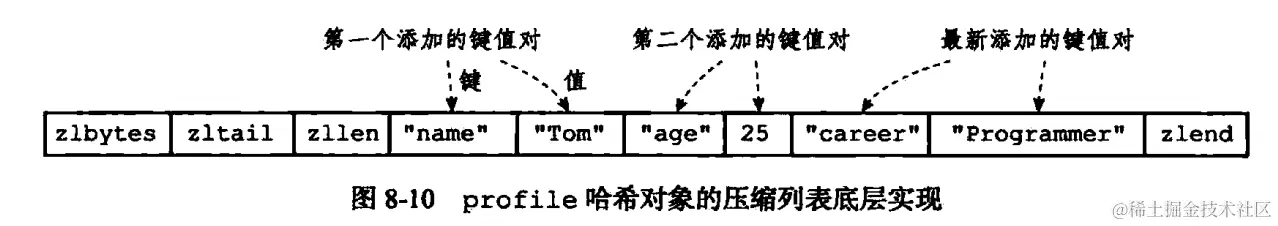 (6)压缩列表(ziplist):压缩列表是列表键和哈希键的底层实现之一。当一个列表键值包含少量的列表项,并且每个列表项要么就是小整数值,要么就是长度比较短的字符串,那么 redis 就会使用压缩列表作为列表键的底层实现。