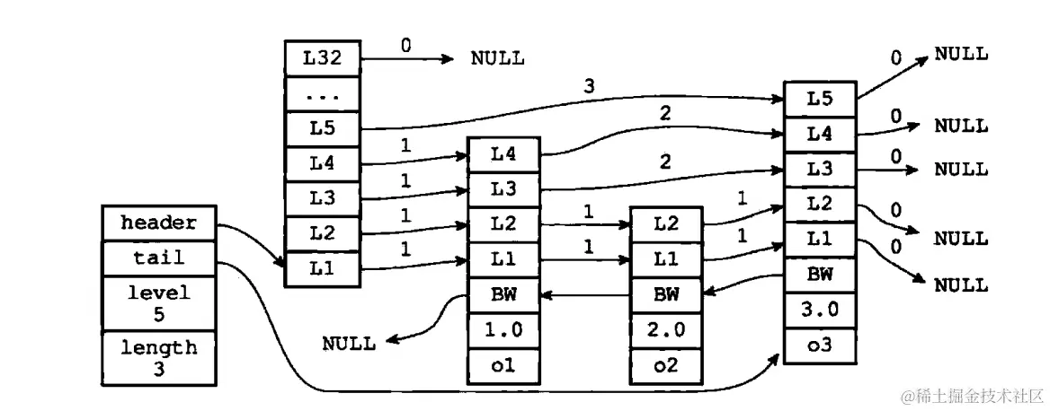 // 注:每个跳跃表的层高都是1 到 32 之间的随机数。