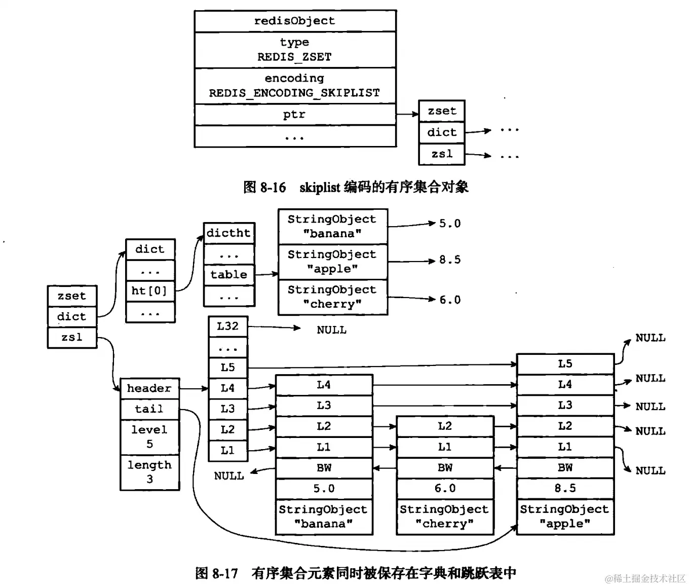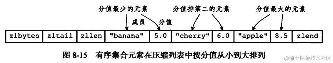 (5)有序集合对象:编码可以是 ziplist 或者是 skiplist(实际上是跳表 + 字典)。