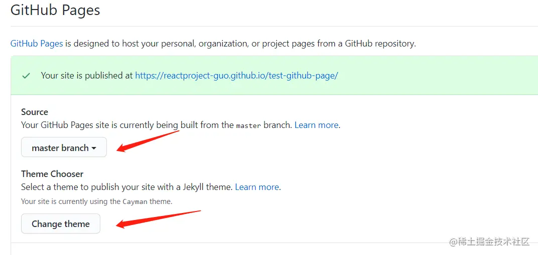 settings->Github Pages需要选择一个主题(不知道什么原因,我最初没有选择,项目部署完成之后打开一直报404)settings -> Github Pages ->Source