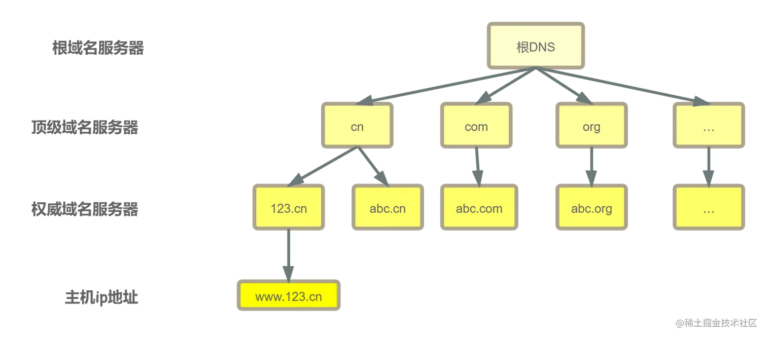 - 顶级域名服务器(Top-level DNS Server):管理各自域名下的权威域名服务器,比如 cn 顶级域名服务器可以返回 123.cn域名服务器的 IP 地址;