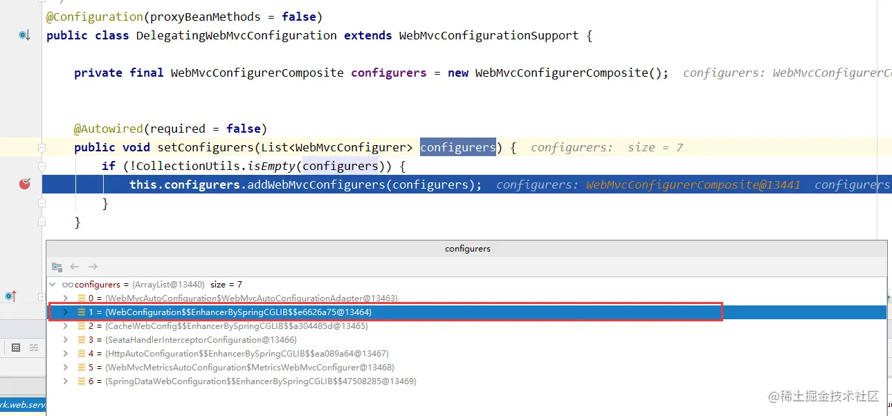 其实就是在springboot启动时执行doCreateBean时,进行调用创建的org.springframework.boot.autoconfigure.web.servlet.WebMvcAutoConfiguration$EnableWebMvcConfiguration会在这里放入进去所有实现了WebMvcConfigurer接口的类,一共有7个,其中就有我们自己实现了WebMvcConfigurer接口的WebConfiguration类,