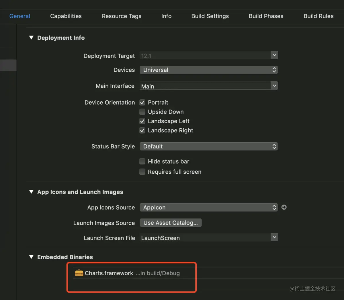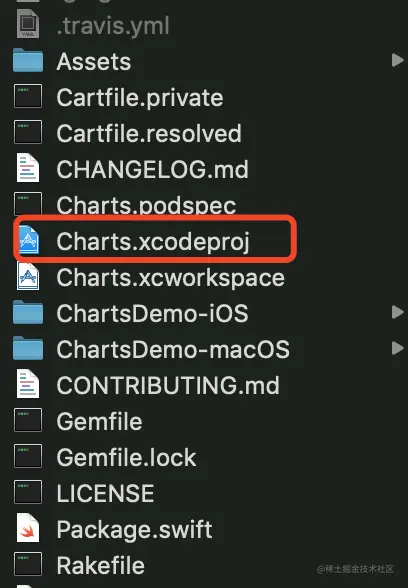 1. 首先创建一个 OC 项目,然后用 pod 安装 Charts,或者直接把 Charts 拉进项目,简单起见,我这里直接将下载好的 Charts.xcodeproj 拉进项目,如下图: