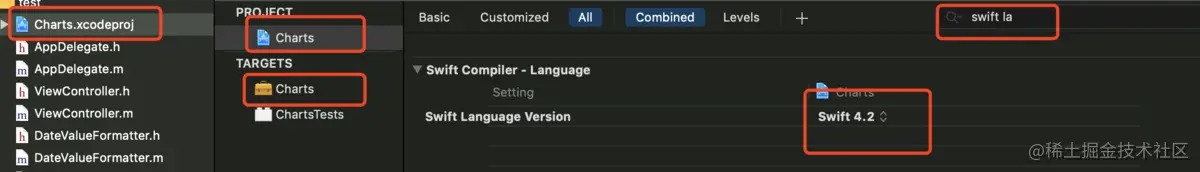 不要忘记拉进来的三方库Charts.xcodeproj 内的 PROJECT 以及 TARGETS的 Swift Language Version 也要更改成和上面的一样,不然会报错。