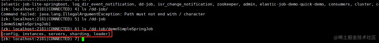 注册中心在定义的命名空间下,创建作业名称节点,用于区分不同作业,所以作业一旦创建则不能修改作业名称,如果修改名称将视为新的作业。作业名称节点下又包含4个数据子节点,分别是config, instances, sharding, servers和leader。