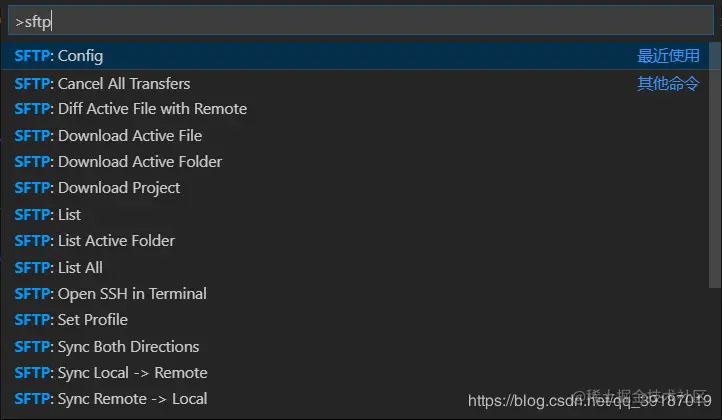 - 在vscode中快捷键 ctrl+shift+P 打开指令窗口,输入sftp,选择SFTP:Config,vscode自动生成sftp.json文件