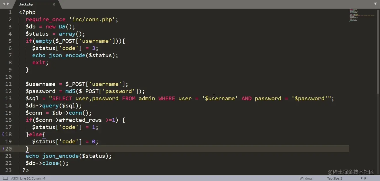 这段PHP代码是根据前端传给不同的用户名和密码状态返回不同的状态码。