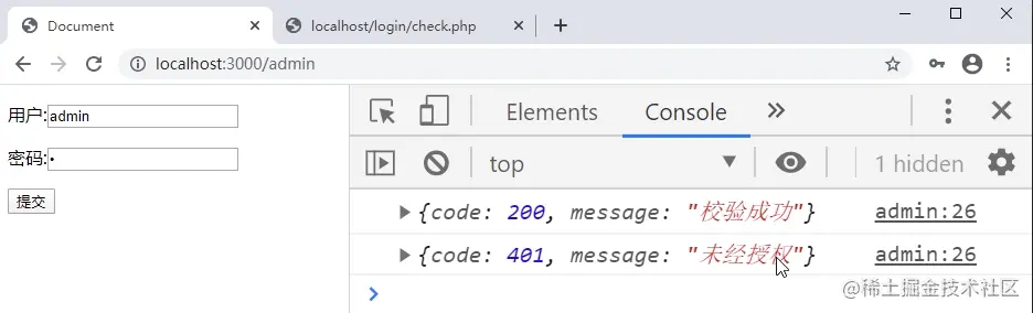 此时登录页面输入用户名和密码点击提交时会输出结构如下代码: