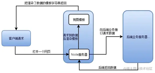 以Node作为中间层,当客户端打开一个网站时,先请求到node服务器这一层,通过node服务器转发请求到后端的服务器,获取数据,然后返给node的模板引擎,根据视图模板渲染好模板字符串页面,再返回给客户端,直接展示页面,如图: