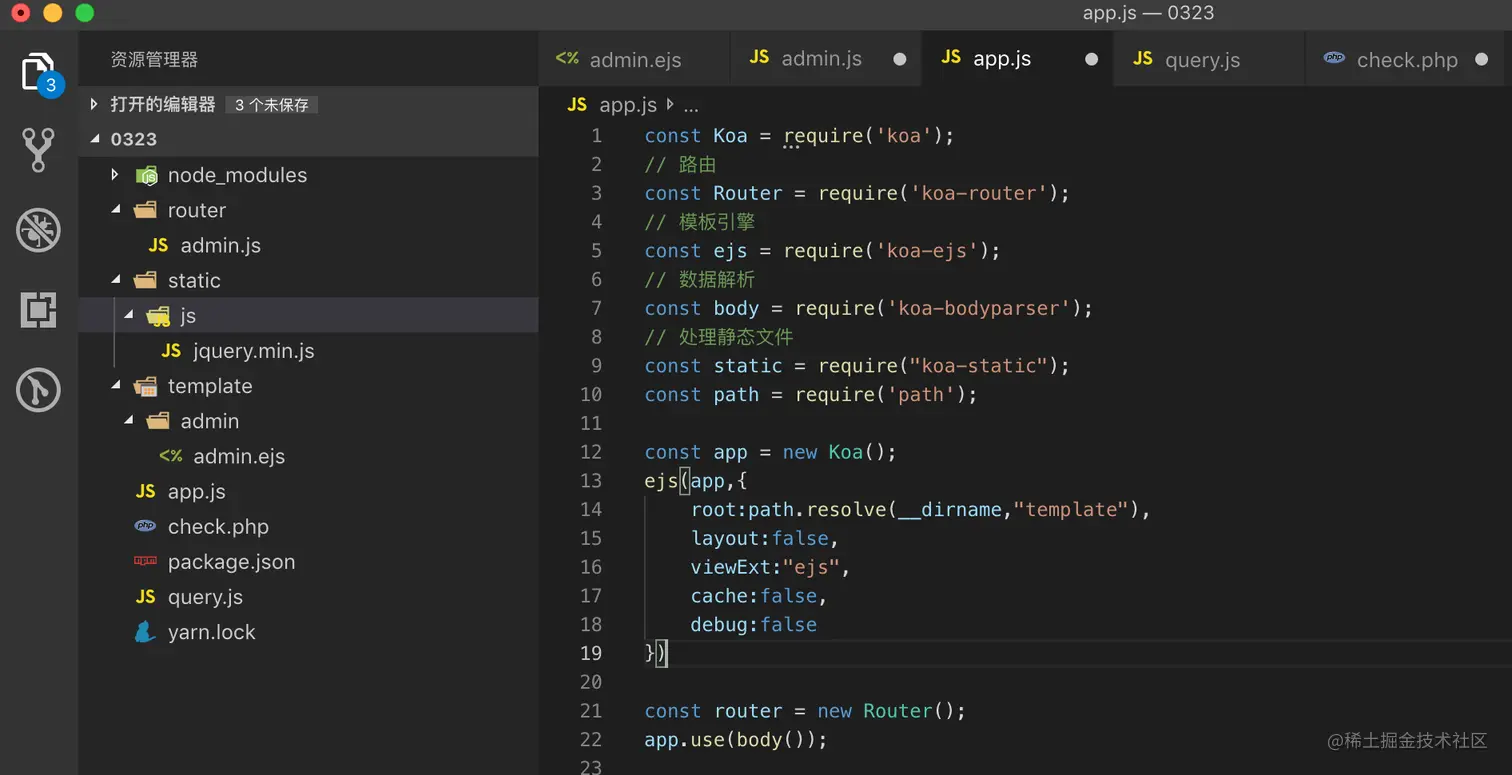 要有三个代码的文件,app.js,admin.js,admin.ejs。