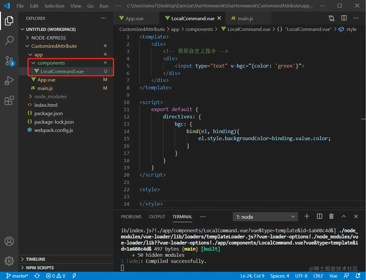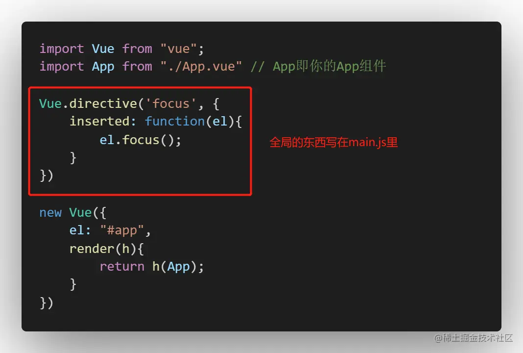 我们之前写的都是全局自定义指令,所以Vue.directive的逻辑都写在main.js里,这样写的自定义指令的作用是全局的,也就是无论是项目中的父组件还是子组件都会受到影响,局部自定义指令就是只作用于单个组件的自定义指令,实现指令的directive逻辑可以作为对象写在组件里,就像我们之前说到methods对象和computed对象等一样,同理,methods对象和computed对象等也是可以写到main.js里作全局逻辑的。