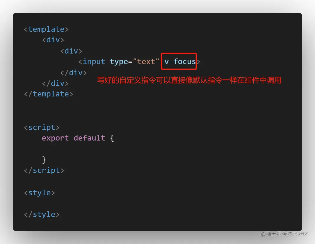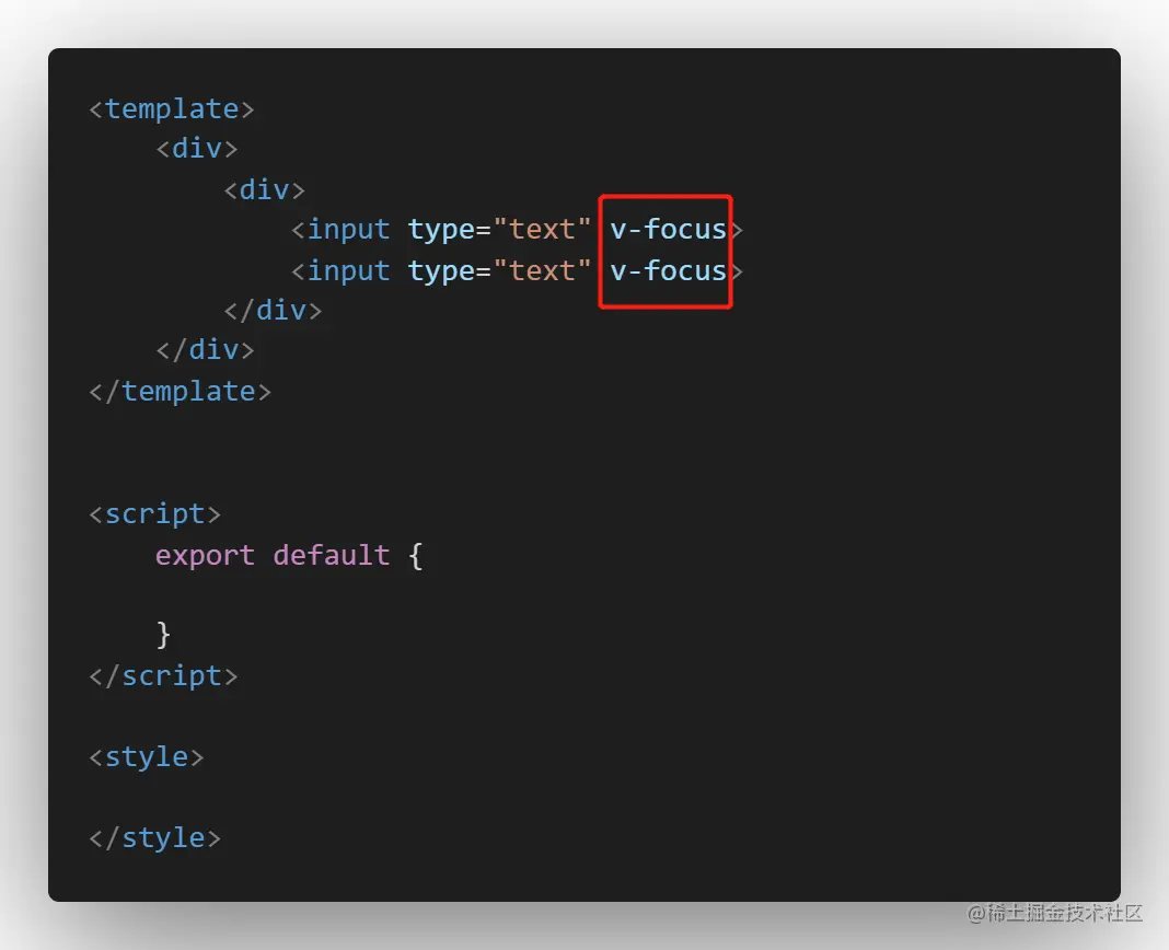 directives对象中可以写多个不同的自定义指令,下面我们在上面的基础上再加上我们之前写的focus指令。