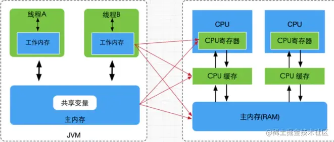 JMM模型与计算机硬件模型直接的对照关系可简化为下图: