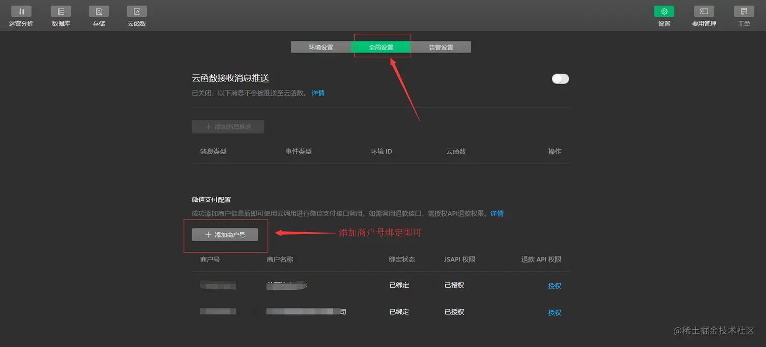 开通微信支付云调用,在云控制台 -> 设置 -> 全局设置中开通,如下所示