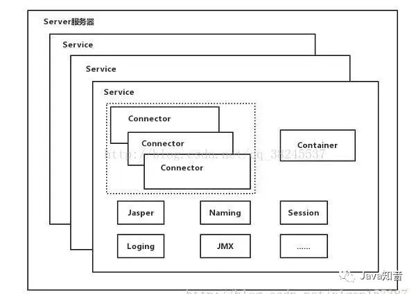 tomcat最顶层容器是Server,代表着整个服务器,一个Server包含多个Service。从上图可以看除Service主要包括多个Connector和一个Container。Connector用来处理连接相关的事情,并提供Socket到Request和Response相关转化。