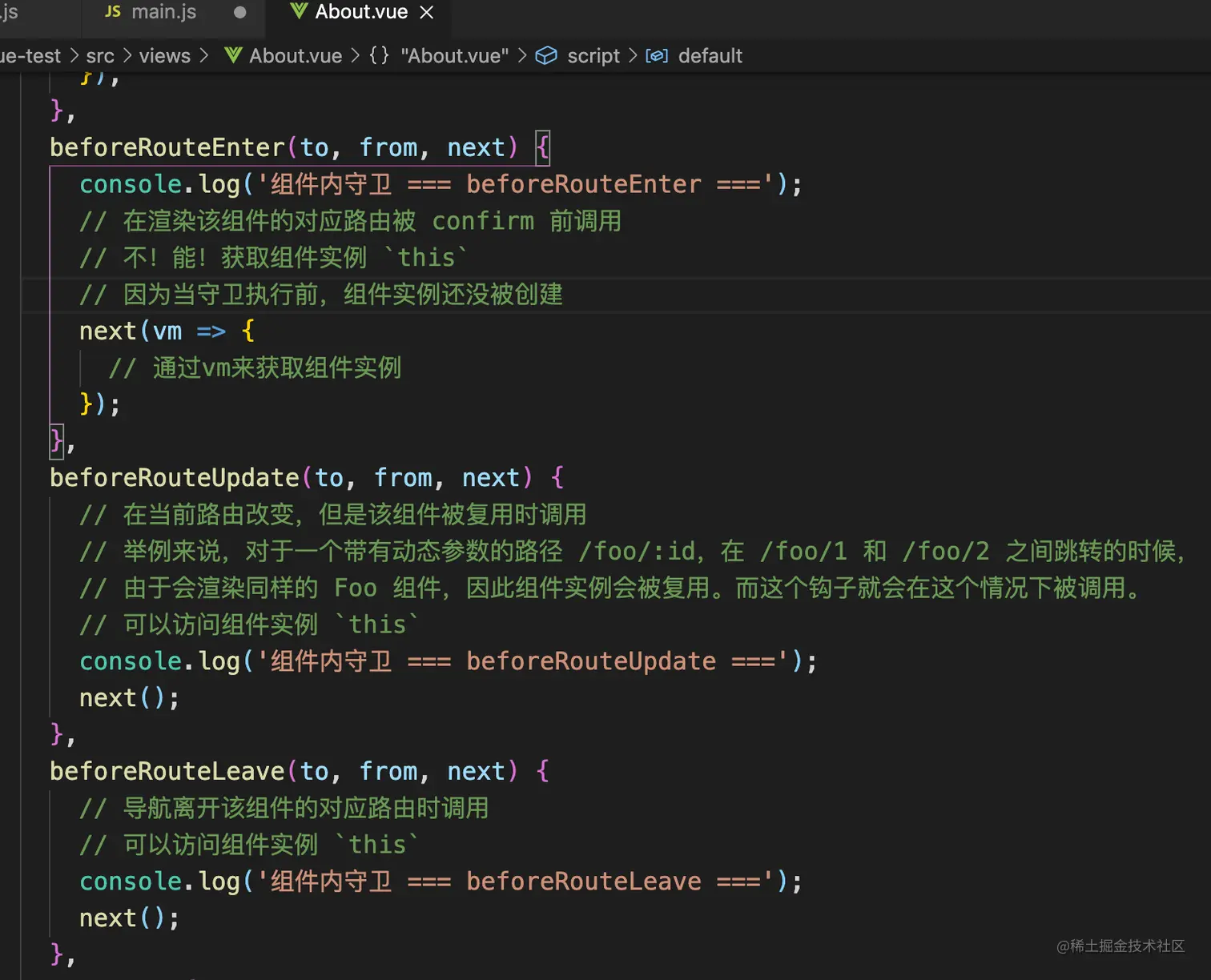 - 在重用的组件里调用 beforeRouteUpdate 守卫 (2.2+)。