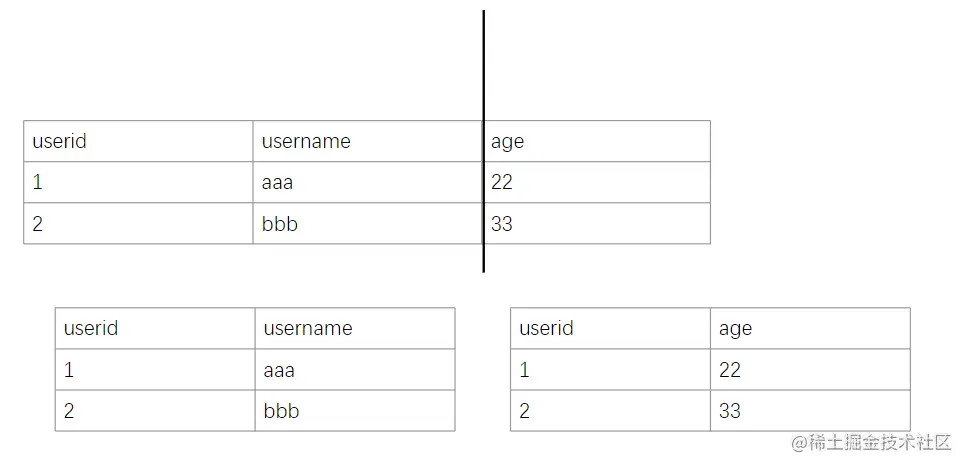 垂直拆分,即拆分列,从业务上将原来一个表的信息拆到两个表中,形象的理解为垂直的一把刀切开了表