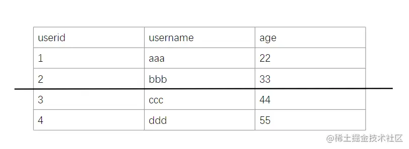水平拆分,即拆分行,通过某种规则将一个表中的数据拆分到不同的表中,形象的理解为水平的一把刀切开了表
