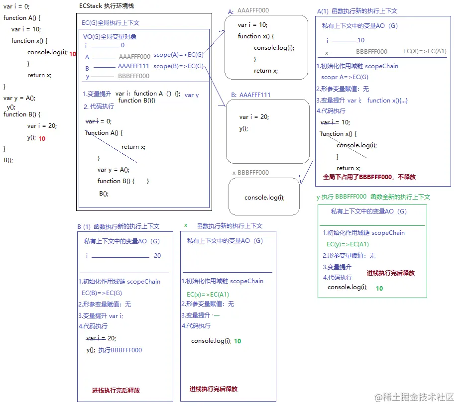 var i = 0; function A() { var i = 10; function x() { console.log(i); } return x; } var y = A(); y();//=>10 function B() { var i = 20; y(); } B();//=>10