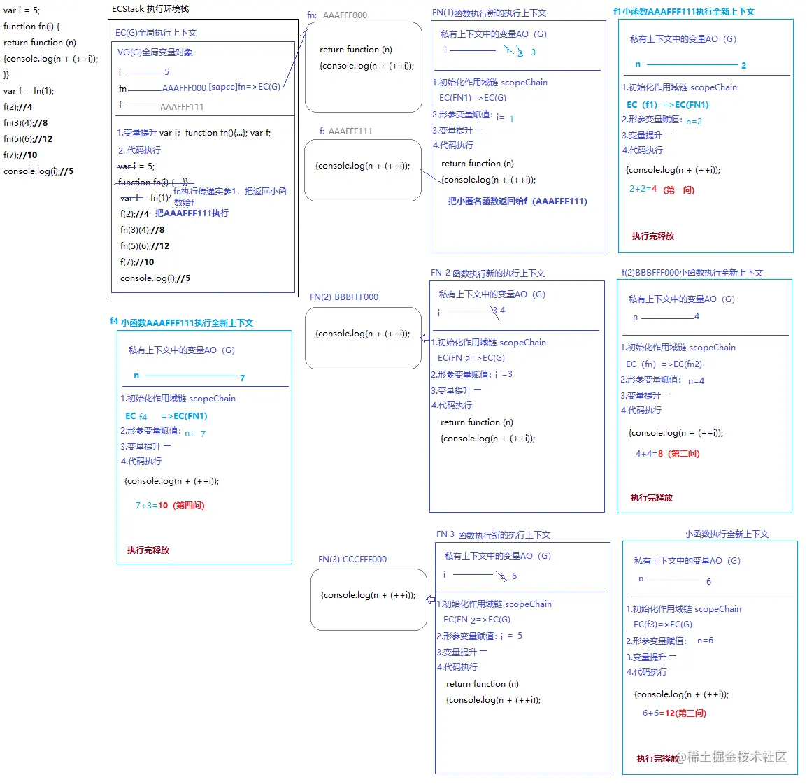 var i = 5; function fn(i) { return function (n) { console.log(n + (++i)); } } var f = fn(1); f(2);//4 fn(3)(4);//8 fn(5)(6);//12 f(7);//10 console.log(i);//5
