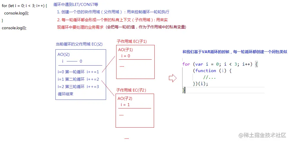 // // 利用ES6中块上下文(作用域)的概念,每一轮循环都会形成一个私有的上下文,里面记录了私有变量的i,i的值分别是每一轮循环的结果 0/1/2...