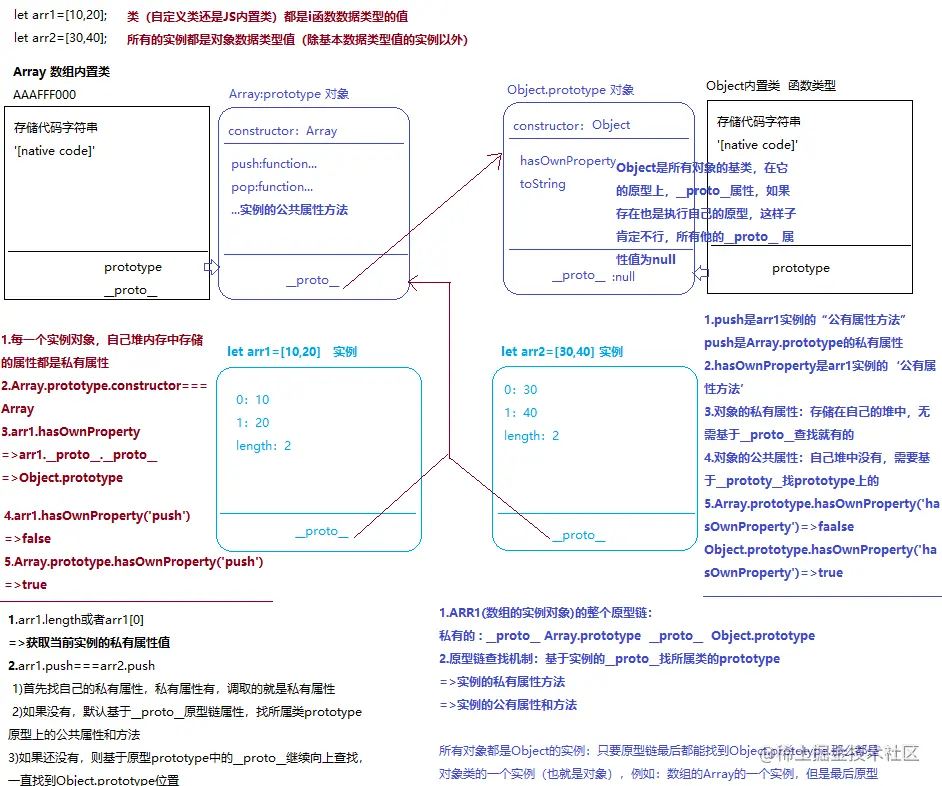 console.log(arr1 instanceof Array); //=>true console.log(arr1.hasOwnProperty('push')); //=>false console.log(arr1.push === arr2.push); //=>true arr1.push(100); //=>对象.属性 说明PUSH是ARR1的一个属性, //而且是公有属性(其它数组中常用的方法也都是数组实例的公有属性)